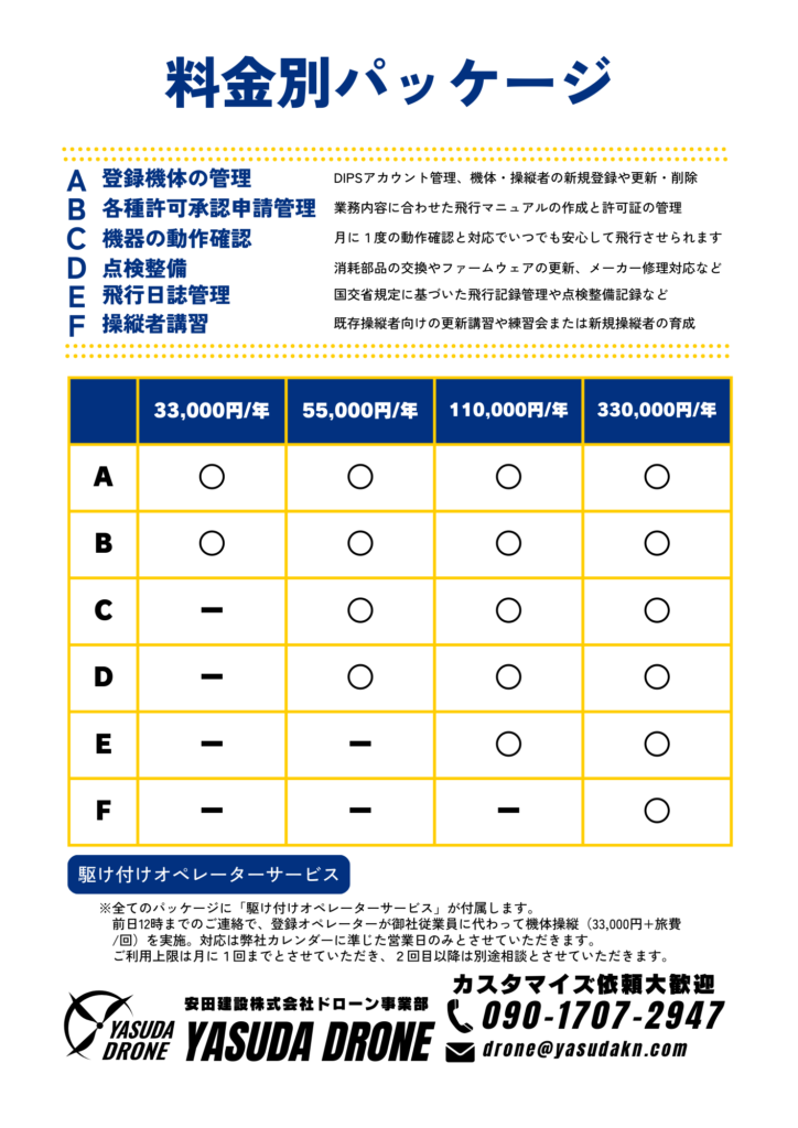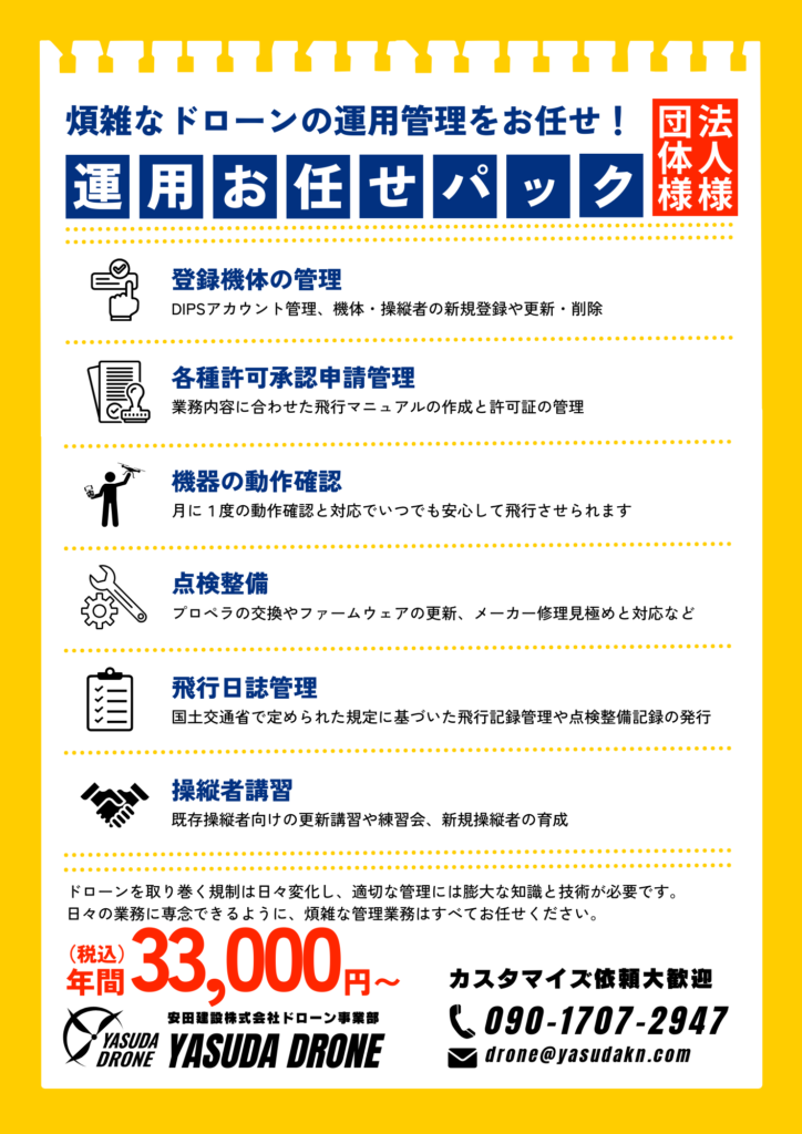 そんな企業や団体様の声を反映し、煩雑になりがちなドローンの運用管理を一手に弊社にお任せいただけるパッケージを作成しました。運用頻度や人数規模に合わせてカスタマイズ可能です。まずは一度お問い合わせください。